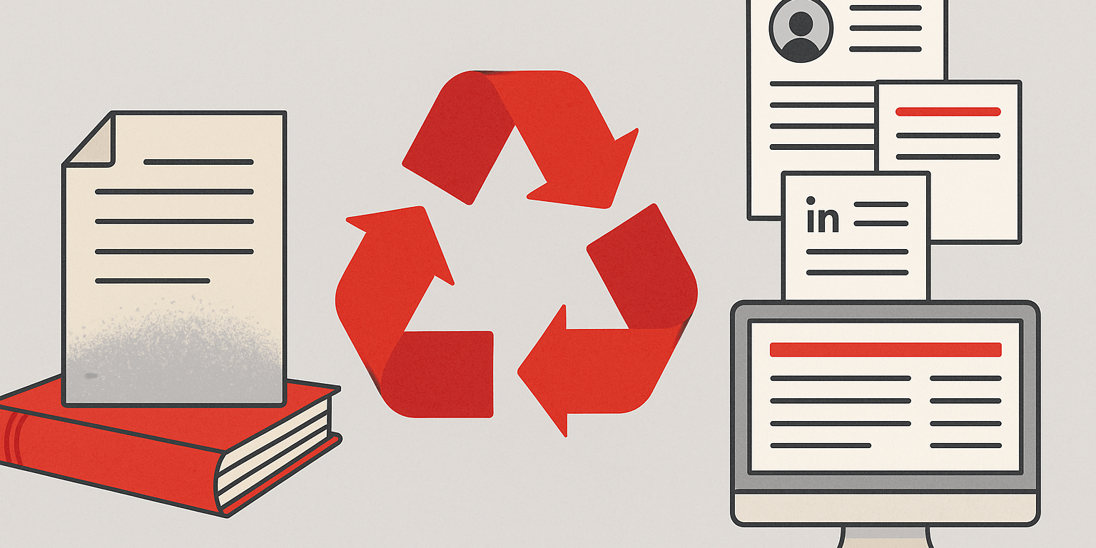 Ein Whitepaper zur Cybersicherheit, ein Interview mit dem Geschäftsführer oder ein Fachbeitrag über die Möglichkeiten von KI in der Finanzbranche – viele Inhalte bieten das Potenzial, sie nochmal neu aufzubereiten. Was dabei zählt, ist ein strategischer Blick auf das Ausgangsmaterial: Was lässt sich neu erzählen? Für welches Format ist welche Perspektive relevant? So wird aus einem Anwenderbericht ein Blogbeitrag mit O-Tönen, aus dem Blogbeitrag ein Testimonial für die Unternehmenswebsite und aus dem Testimonial ein LinkedIn-Post. Der Schlüssel: strategisches Denken über Kanäle hinweg.